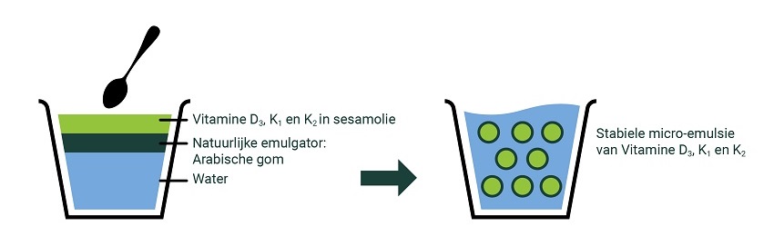 Vitamine D en vitamine K zijn beide vet oplosbare vitaminen. Een optimale werking van lever en gal is dan ook nodig om een goede opname te waarborgen. Spijsverteringsproblemen, leverzwakte (leververvetting) en problemen met de galdoorstroming leiden allemaal tot malabsorptie van vaak de vet oplosbare nutriënten. Biotics Research Corporation heeft een unieke micro-emulsietechniek ontwikkeld (ActiVmulsion) voor alle vet oplosbare vitaminen en nutriënten als co-enzym Q10 en kurkuma. Het resultaat is een bijzonder hoge biologische beschikbaarheid (= opname) via lymfesysteem en bloedbaan terwijl spijsvertering, lever en galblaas niet belast worden. De grootte van de geëmulgeerde deeltjes is gelijk aan de kleinst mogelijke druppels (0,5 micron) zoals deze in de natuur voorkomen, bijvoorbeeld in moedermelk. Er worden uitsluitend natuurlijke emulgatoren gebruikt (bv. Arabische gom) wat belangrijk is naar veiligheid en gezondheid toe. Vaak worden bij emulgeertechnieken synthetische emulgatoren als carboxymethylcellulose (CMC) of Polysorbaat 80 gebruikt die een nadelige invloed hebben op darmpermeabiliteit en chronische ontsteking bevorderen. [15-17]